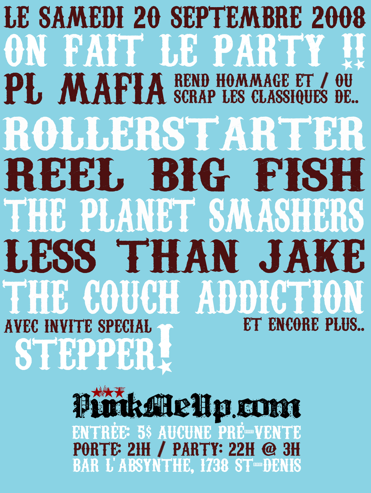 QUI: PL MAFIA qui fait un hommage aux grands du ska punk des 15 dernières années (ROLLERSTARTER, REEL BIG FISH, THE PLANET SMASHERS, LESS THAN JAKE, COUCH ADDICTION) et STEPPER.